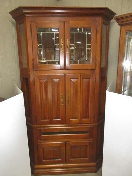 Albrecht Auctions Large Corner Cabinet From Art Sample Furniture Set Up To Be Used As An Entertainment Center Shelf Used For Tv Beveled Glass Doors